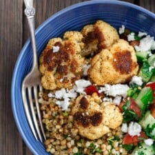 Bring 2 cups of water, ¼ cup julienne cut sun dried tomatoes, and ½ tablespoon sun dried tomato oil to a boil in a 2 quart saucepan (affiliate link) over high heat. Divided into two portions and place roasted vegetables from the air fryer over the couscous. Heat to boiling on high. In a large bowl, add the couscous and vegetables. Turn off the heat and wait until the couscous is done cooking.